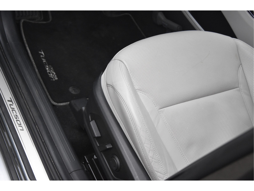 Dit is een gave Hyundai Tucson, vrijwel volledig full options, uitgevoerd in een prachtige en unieke kleurcombinatie: een stijlvol grijs-groen exterieur met een ivoorkleurig interieur.