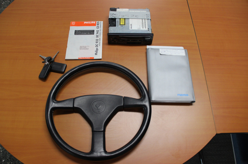 Hij heeft in al die jaren wel een paar kleine upgrades ondergaan, echter een aantal onderdelen zijn bewaard gebleven zoals het originele stuur en de retro Philips radio/CD speler(incl. handleiding) van destijds. Dus nagenoeg 100% origineel, ongerestaureerd & roestvrij! De (onderhouds)boekjes, 2 originele sleutels incl. 2 afstandsbedieningen, sleutelplaatje/code, originele Mazda diefstalblokkering(Finish Line), gereedschapset het is allemaal compleet aanwezig. Daarnaast heeft ie ook nog eens een zeer unieke kilometerstand met slechts 63.407 km op het klokje(NAP).